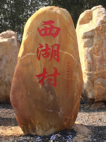 2015年1月河源龙川铁杨镇西湖村向我司订购了一块长广东景观刻字黄蜡石。村碑石虽是一种静物,却具有一种动态,在动态中呈现出活力,生气勃勃,能勃发出一种审美的精神效果。是现代园林、广场、道旁、门庭、校园、企业、机关、绿化布景中不可或缺的景观。